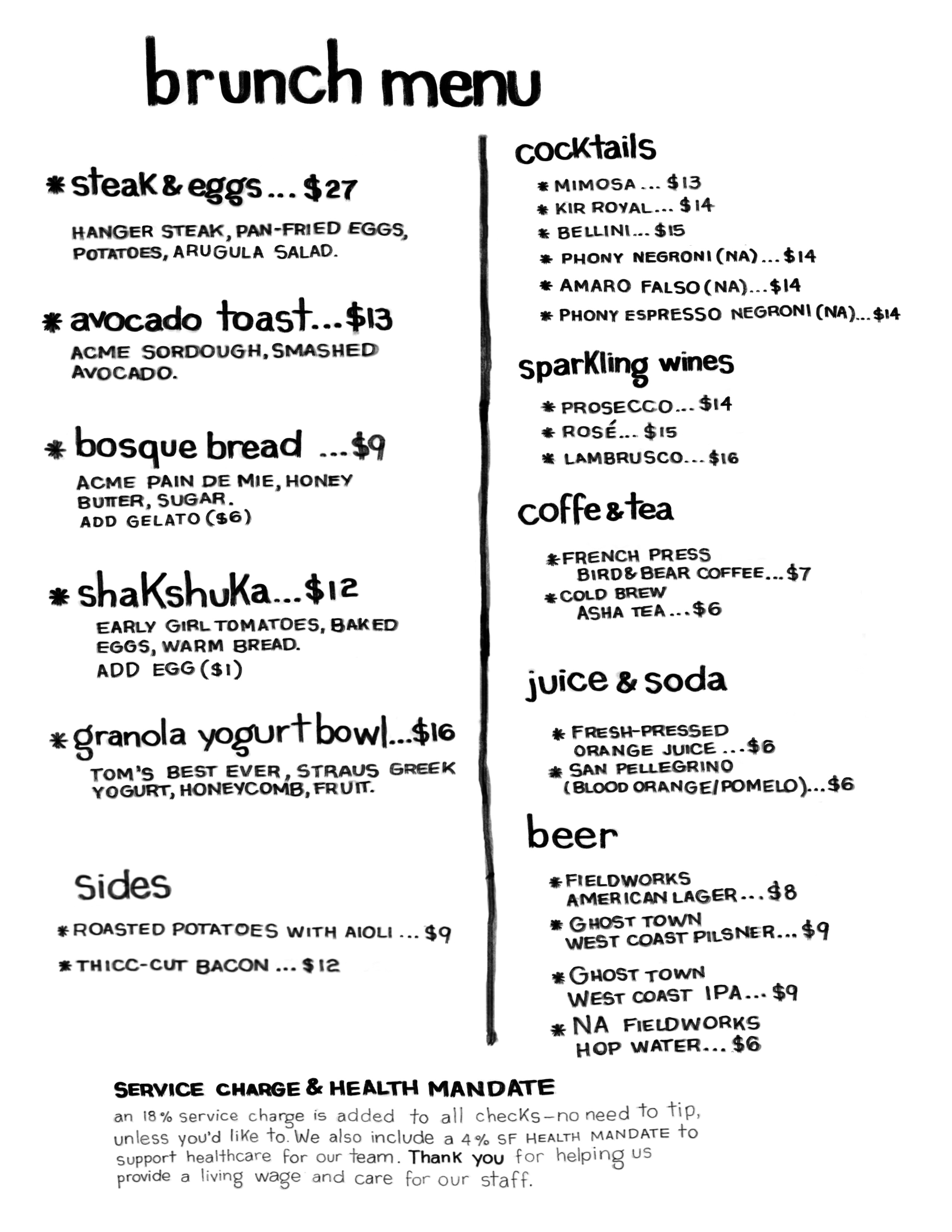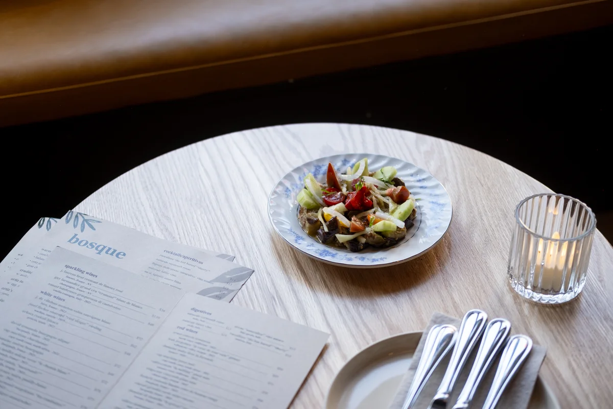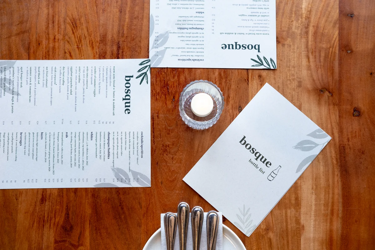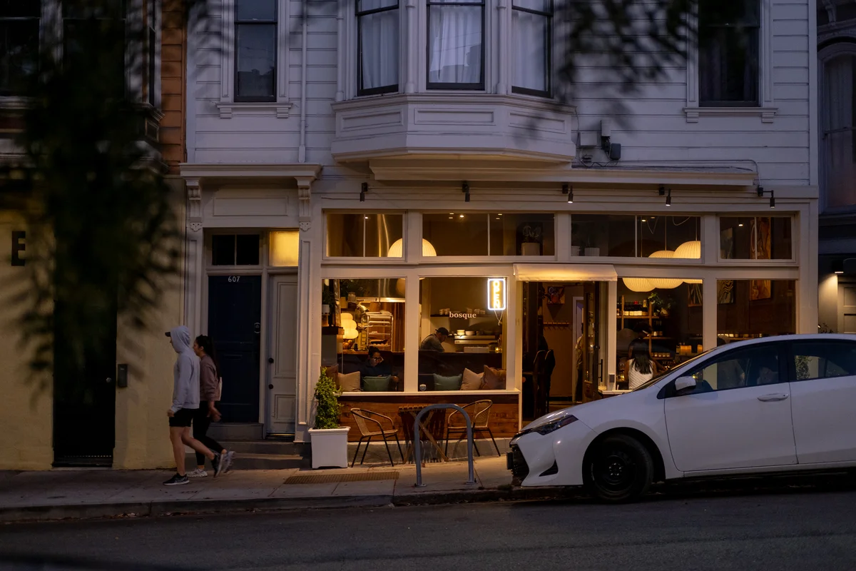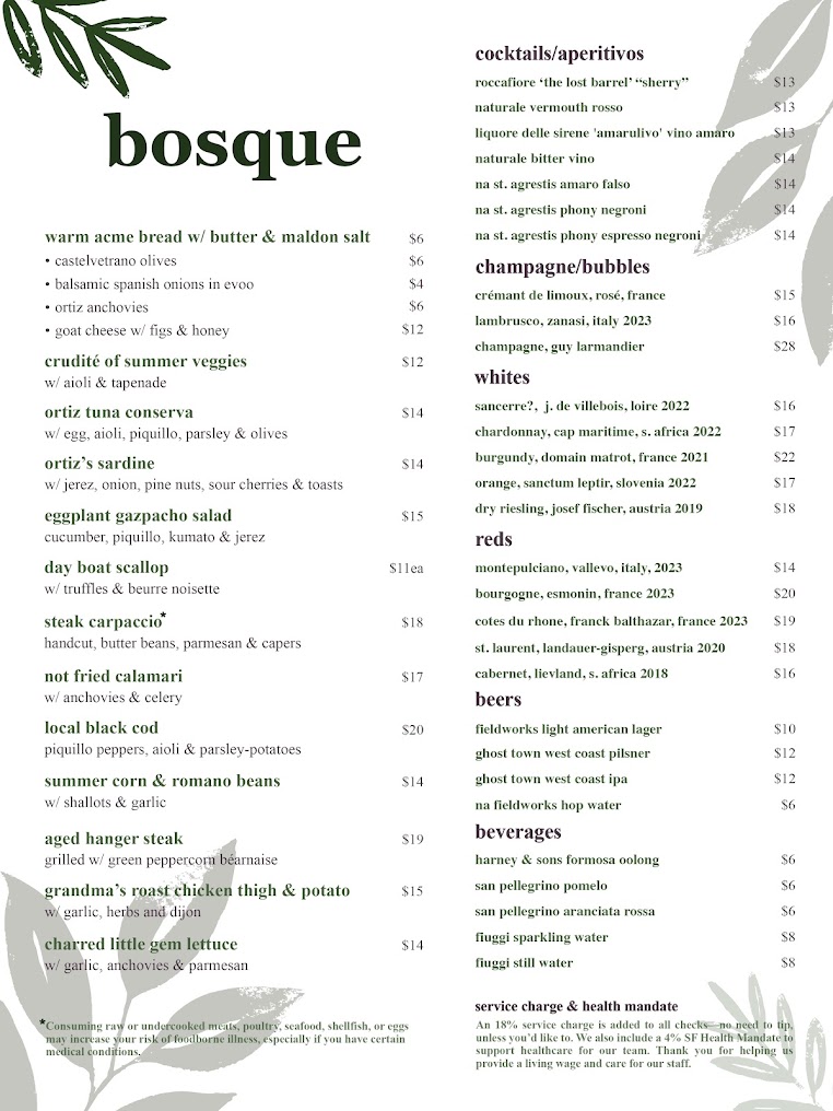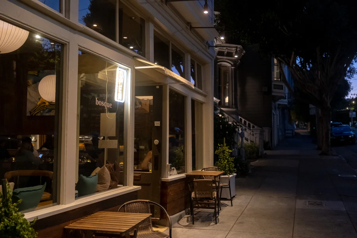 Just on the edge of the Hayes Valley commerce area, Bosque offers an intimate wine bar experience that pairs with a seasonal rotating food menu. Our carefully curated selection of wine, champions smoothness and quaffability. The name "bosque" - means forest in Spanish. The owner's dog, Forest, who you'll sometimes see running the front of house.