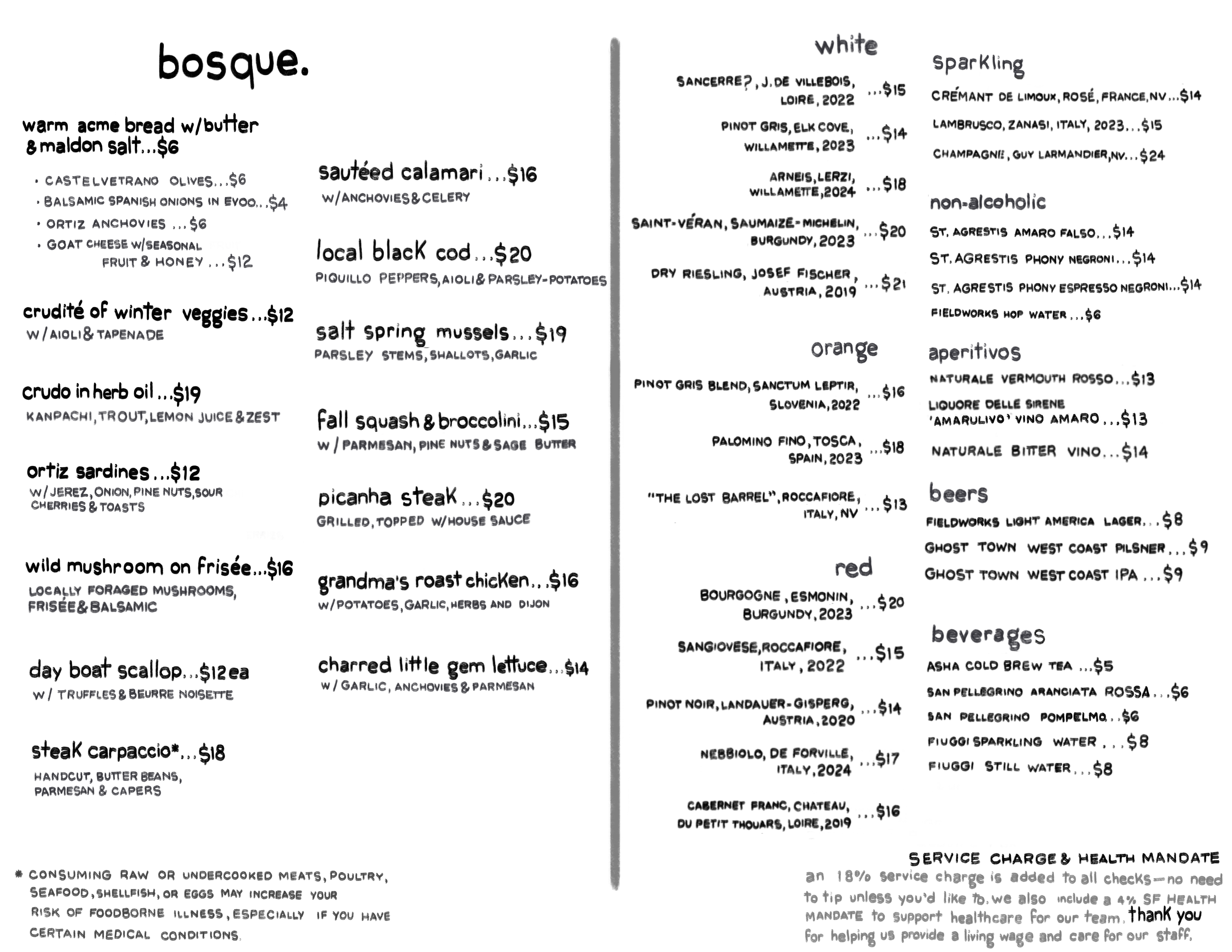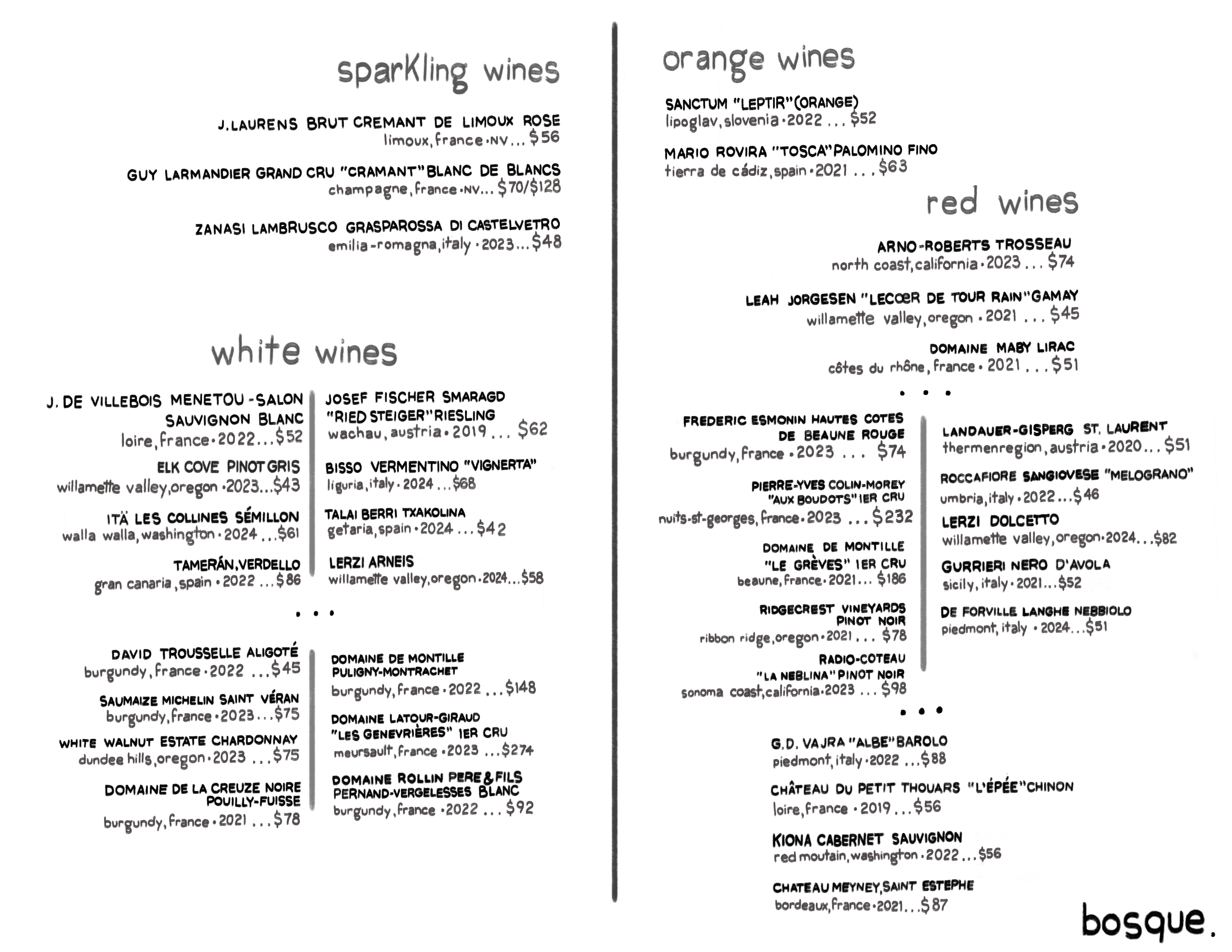 nestled at the edge of the hayes valley, bosque is an intimate wine bar with a seasonal food menu. our selection of wine is easy to drink, fun, and approachable. the name "bosque" - means forest in spanish. it's named after my dog, forest, who you'll sometimes see running the front of house.